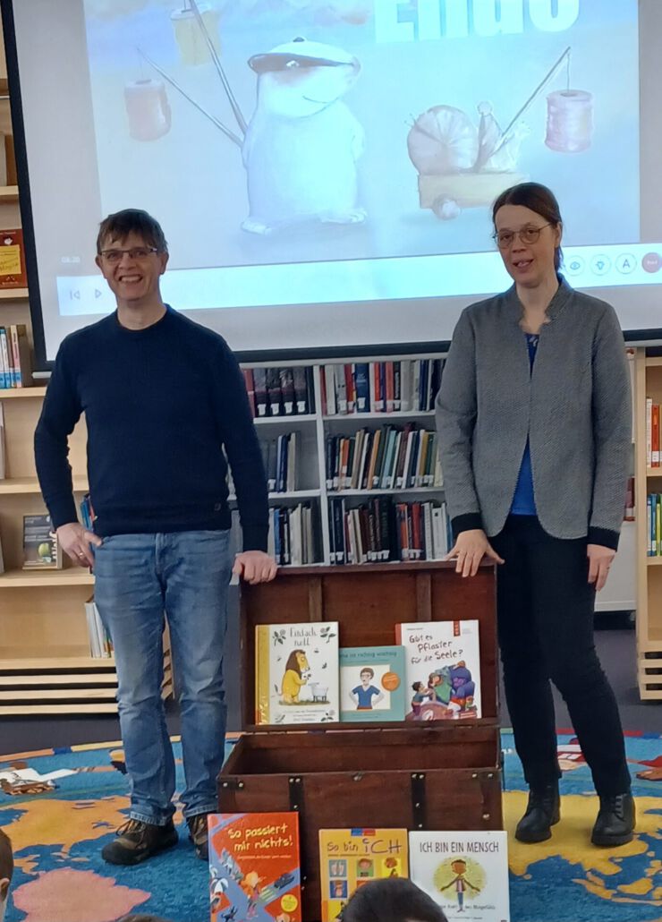Am 18.02.2025 fanden wieder zwei Vorlese-Aktionen in dieser Kooperation statt. Für jeweils eine Gruppe der Katholischen KiTa Frauenberg und des Evangelischen KiGa Christuskirche las von Donop das Bilderbuchkino „Dachs hat schlechte Laune“ vor und gemeinsam mit dem Team vom Kinder- und Jugendbereich der HLSB konnte ein wichtiger Einstieg in die Medienarbeit zu diesem Thema gefunden werden.