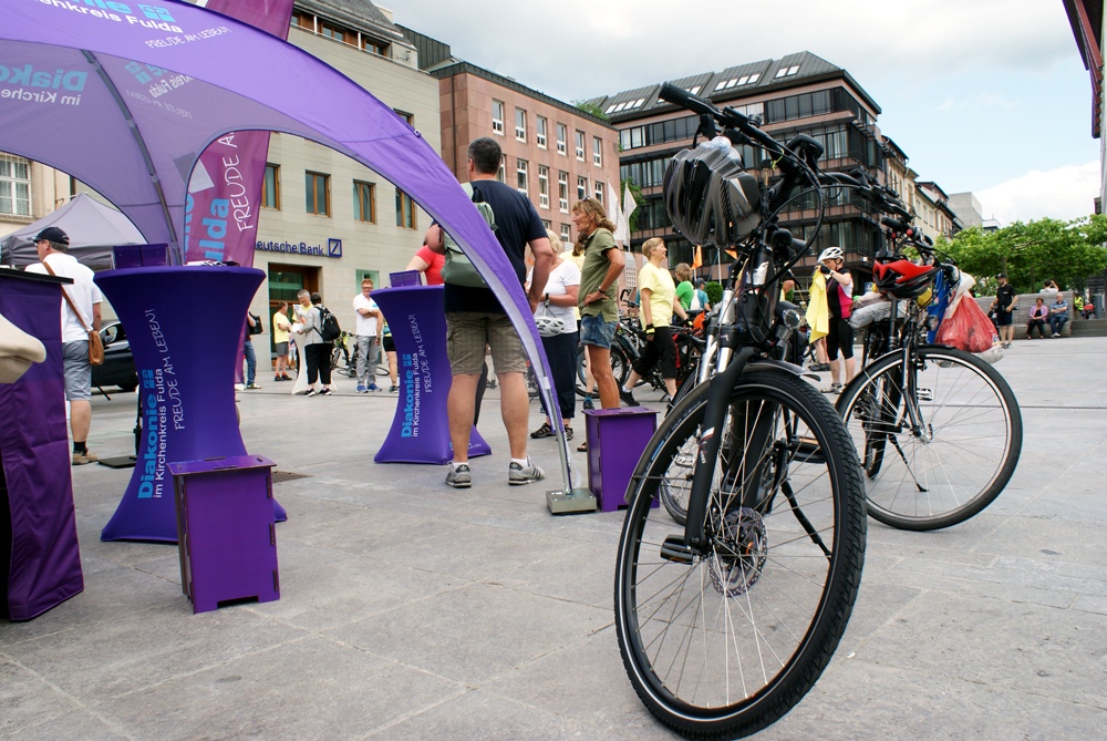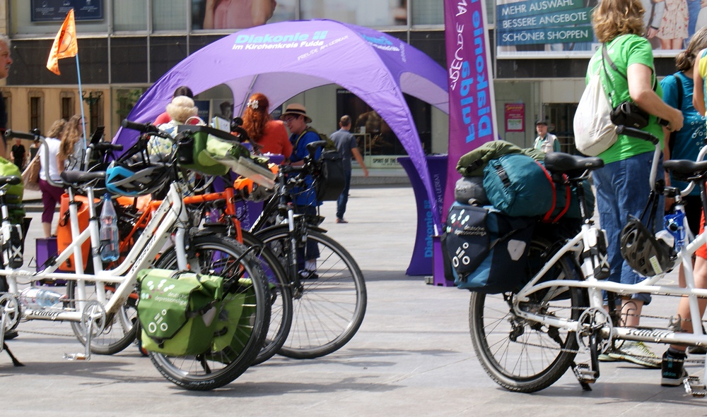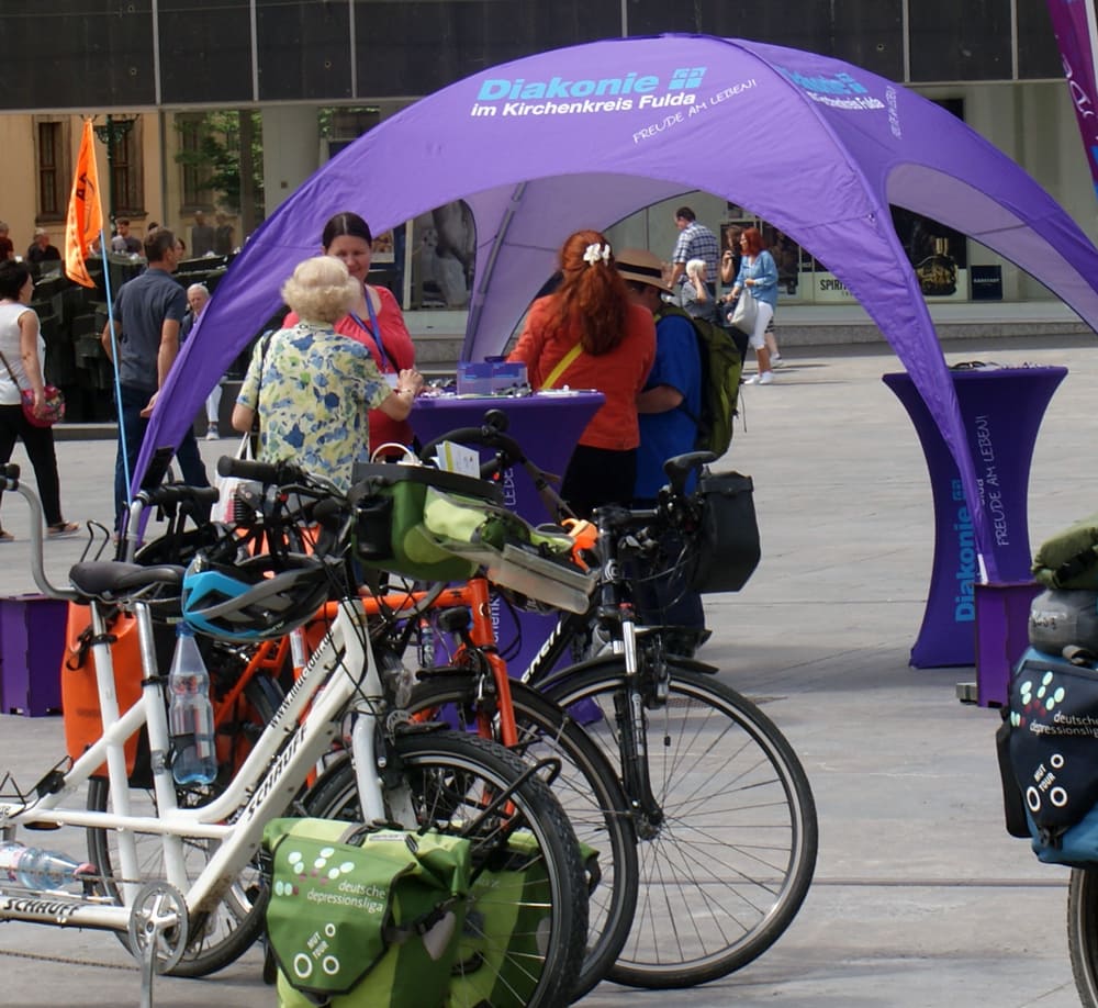 Am 15. Juni 2019 hat die Mut-Tour Station am Universitätsplatz in Fulda gemacht. Auch wir von der Diakonie Fulda waren dabei und haben die beiden Teams bei ihrer Fahrt durch Deutschland in Fulda ein kleines Stück begleitet. Parallel zur Fahrradtour konnten Interessierte an unserem Stand mit unseren Mitarbeiter*innen ins Gespräch kommen und sich über Hilfs- Förder- und Unterstützungsangebote zum Thema Depression und anderen psychischen Erkrankungen informieren.
