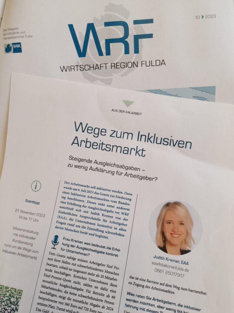 In der Ausgabe 10/2023 des Magazins „Wirtschaft Region Fulda“ der Industrie und Handelskammer Fulda (IHK) hat unsere Mitarbeiterin, Judith Kremer, Einheitliche Ansprechstelle für Arbeitgeber (EAA) der Diakonie Fulda, Fragen zum Inklusiven Arbeitsmarkt beantwortet.